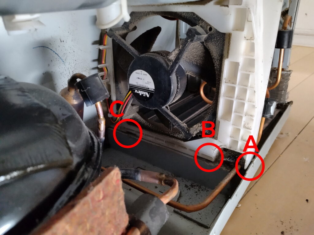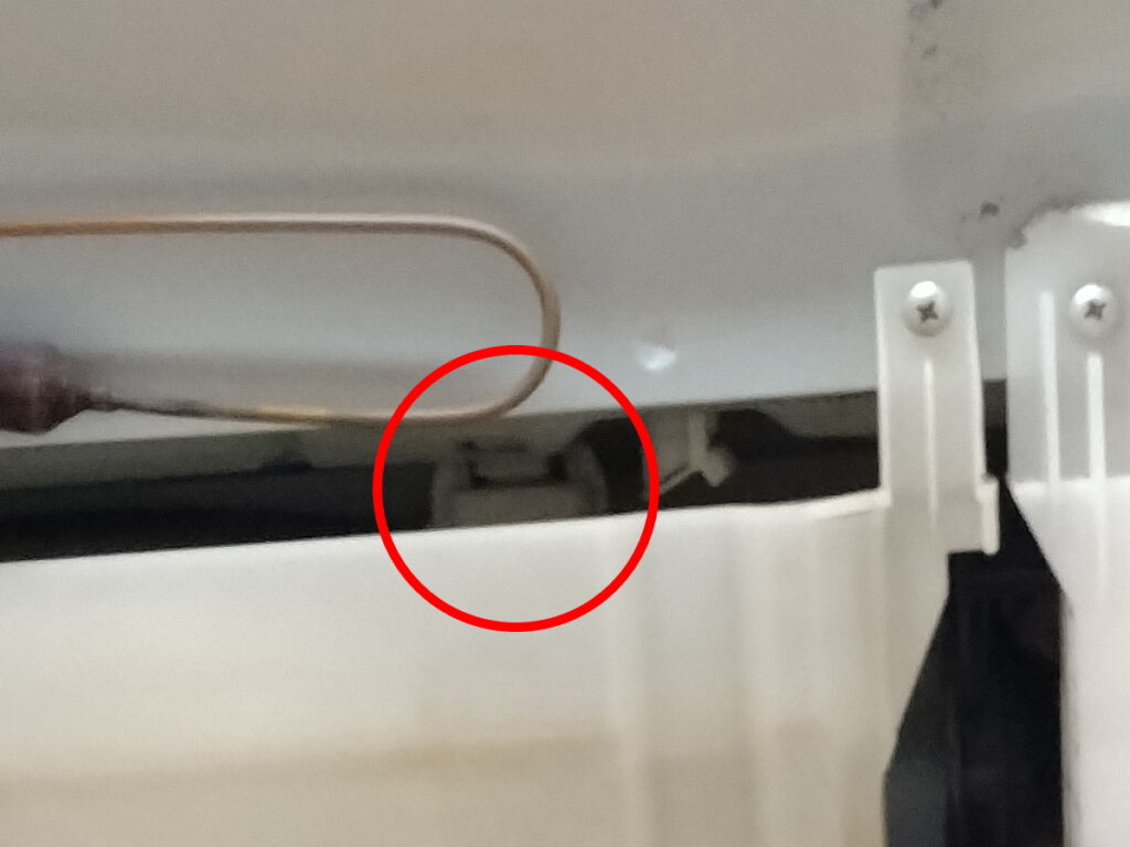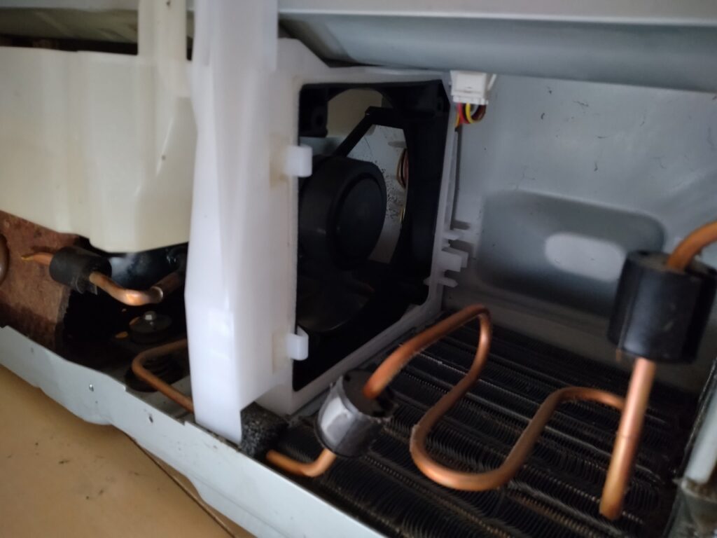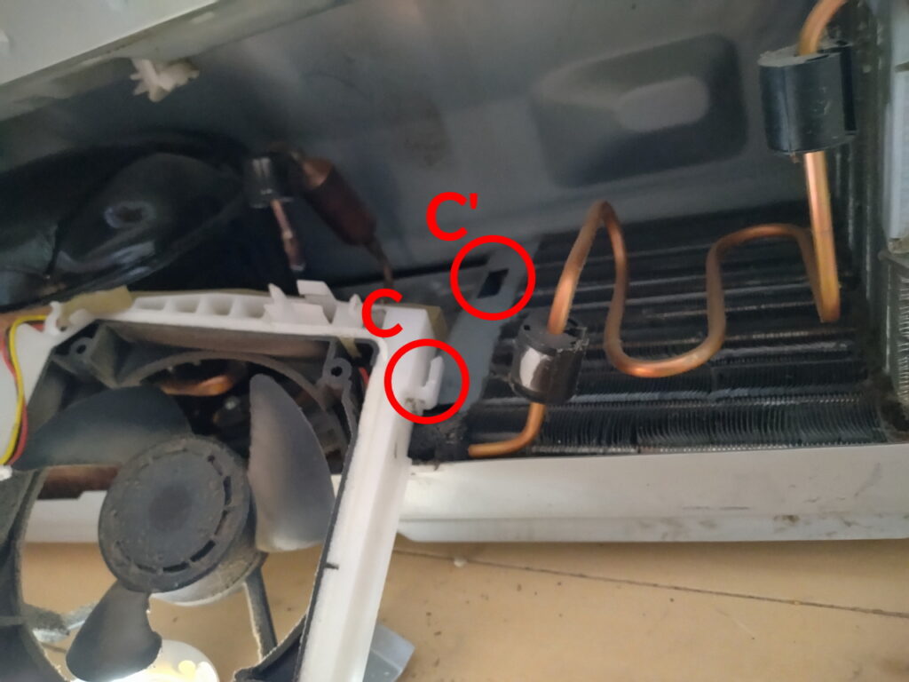 ファンのAの突起を冷蔵庫のフレームを越すように持ち上げるようにして引っ張り出します。